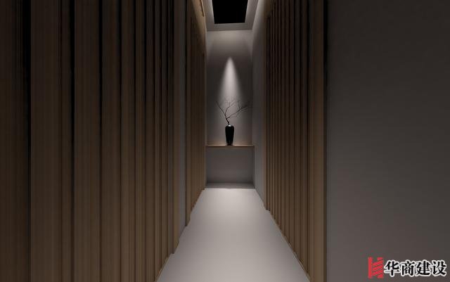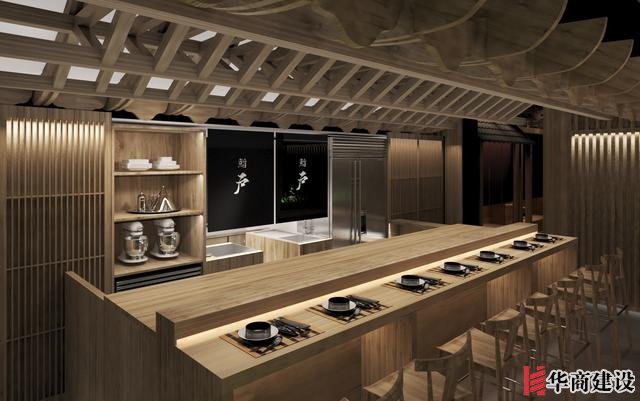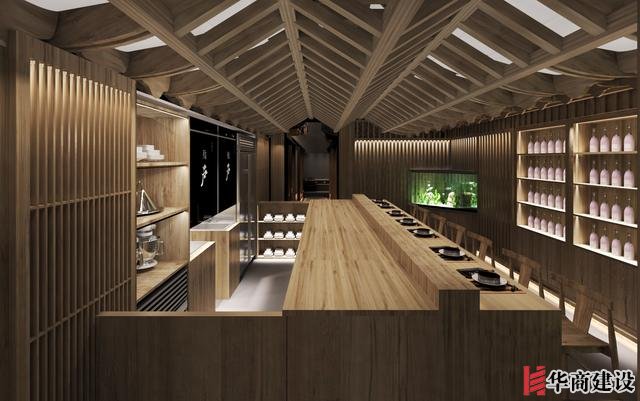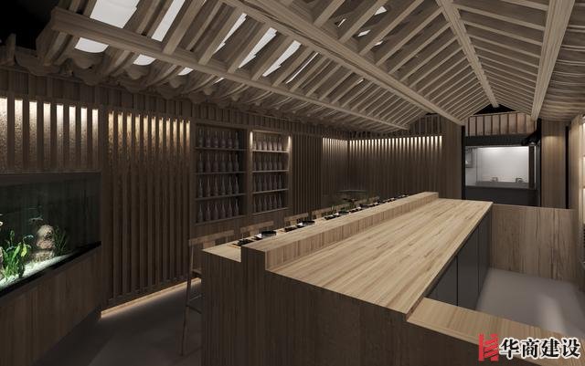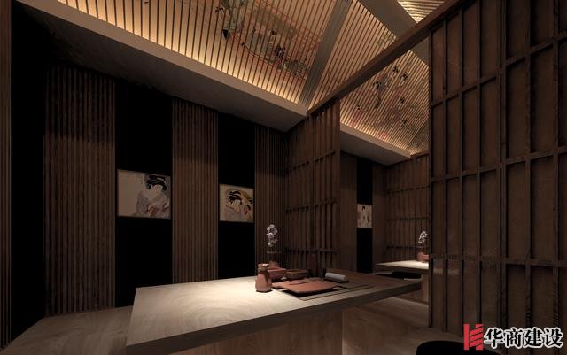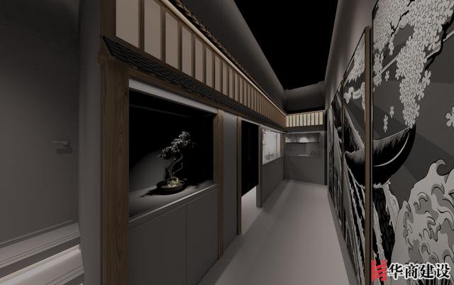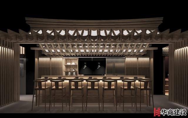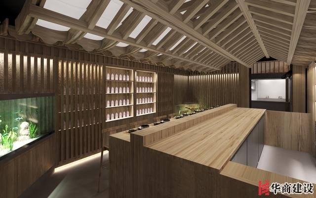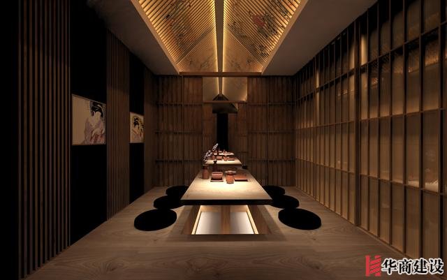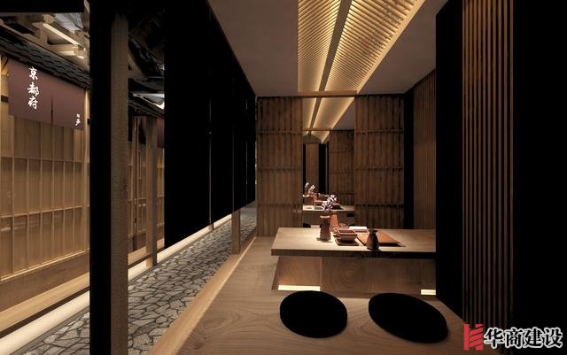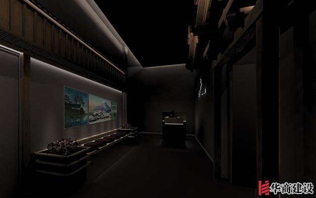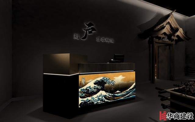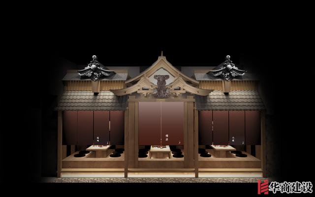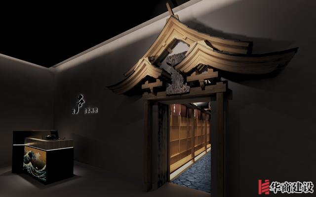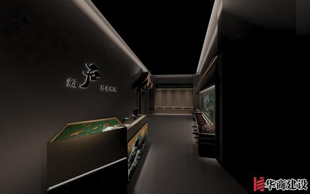本案在設(shè)計(jì)中利用該店狹長(zhǎng)的特點(diǎn)將日本建筑理念融入餐廳空間設(shè)計(jì),創(chuàng)作出日本胡同的延伸感。整體設(shè)計(jì)以日本原生文化為基調(diào),在空間裝飾上以木制材料為主,配以青石、屋檐、壁畫、雕塑營(yíng)造出濃郁日本文化和古樸自然之美。而屋脊端頭鬼瓦的裝飾看似不經(jīng)意,卻最能襯托出日式“精致”之感,在餐廳入口處設(shè)置流動(dòng)氣息的水池,代表著靜中有動(dòng)的生命力,與整體沉穩(wěn)內(nèi)斂的基調(diào)形成對(duì)比。