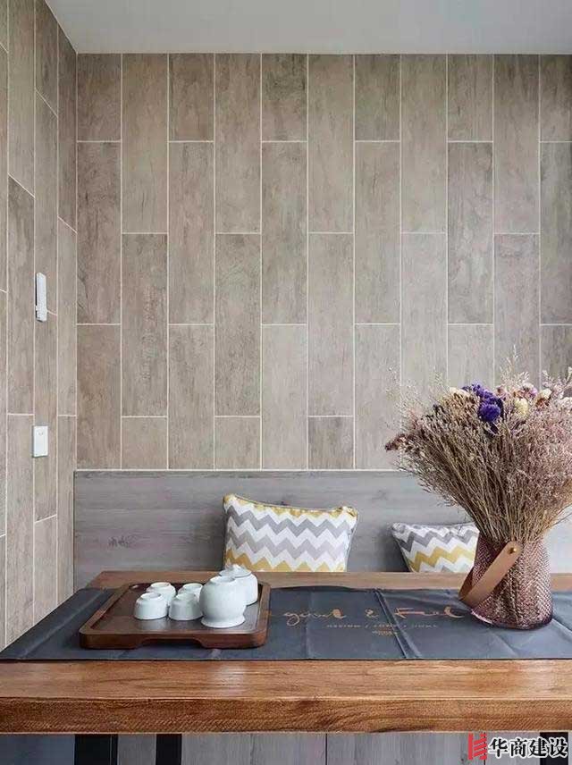 第二種:仿木紋磚+休閑卡座。傳統(tǒng)觀念里頭卡座只有餐廳可以設(shè)計(jì),其實(shí)陽臺也是可以的,陽臺空間狹小,墻面使用溫潤的木紋瓷磚,小卡座搭配原木休閑桌,一處小茶室空間就有了。