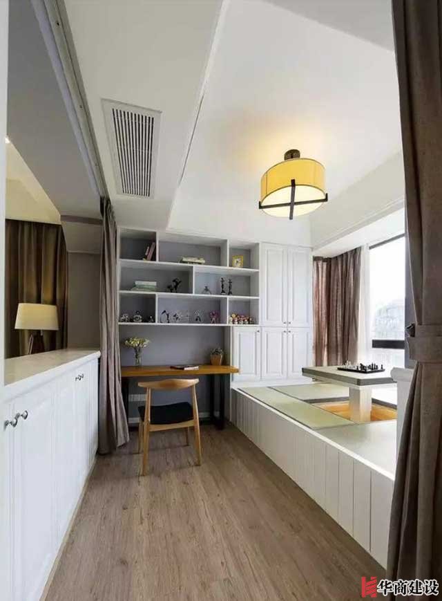 第七種:陽臺變客房。陽臺可以與室內(nèi)打通借用空間,做成書房兼客房區(qū)域,充分利用陽臺。平時就是休閑功能,如果家里人多,隨時可以變?yōu)榭头抗δ堋?br />