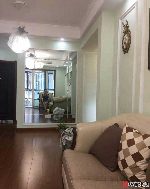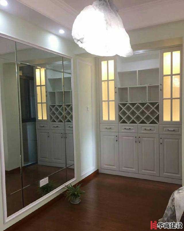 這邊是餐廳,做了一個酒柜,顯得特別大氣,而且還可以提供非常充足的收納空間,也很大氣。做了鏡子背景墻,通過鏡子的反射,顯得室內(nèi)空間比較寬敞,沒有那么擁擠的感覺。餐桌我們打算買方形的。頂面吊燈已經(jīng)保護著,這樣子就不會擠壓灰塵啦。